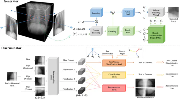 Image credit: DisplaysIn clinical diagnosis, doctors usually judge the information by a few X-rays to avoid excessive ionizing radiation from harming the patient. The recent Neural Radiance Field (NERF) technology contemplates generating novel-views from a single X-ray to assist physicians in diagnosis. In this task, we consider two advantages of X-ray filming over natural images: (1) The medical equipment is fixed, and there is a standardized filming pose. (2) There is an apparent structural prior to X-rays of the same body part at the same pose. Based on such conditions, we propose a Pose-Guided generative radiance field (PGgraf) containing a generator and discriminator. In the training phase, the discriminator combines the image features with two kinds of pose information (ray direction set and camera angle) to guide the generator to synthesize X-rays consistent with the realistic view. In the generator, we design a Density Reconstruction Block (DRB). Unlike the original NERF, which directly estimates the particle density based on the particle positions, the DRB considers all the particle features sampled in a ray and integrally predicts the density of each particle. Experiments comparing qualitative-quantitative on two chest datasets and one knee dataset with state-of-the-art NERF schemes show that PGgraf has a clear advantage in inferring novel-views at different ranges. In the three ranges of 0°to 360°, -15°to 15°, and 75°to 105°, the Peak Signal-to-Noise Ratio (PSNR) improved by an average of 4.18 decibel, and the Learned Perceptual Image Patch Similarity (LPIPS) improved by an average of 50.7%.