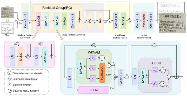 Image credit: Applied IntelligenceExisting scene text image super-resolution (STISR) methods primarily focus on the restoration of fixed-size English text images. Compared to English characters, Chinese characters present a greater variety of categories and more intricate stroke structures. In recent years, Transformer-based methods have achieved significant progress in image super-resolution task, but face the dilemma between global modeling and efficient computation. The emerging Receptance Weighted Key Value (RWKV) model can serve as a promising alternative to Transformer, enabling long-distance modeling with linear computational complexity. In this paper, we propose a Hybrid CNN-RWKV with High-Frequency Enhancement (HCR-HFE) model for STISR task. First, we design a recurrent bidirectional WKV (Re-Bi-WKV) attention which integrates bidirectional WKV (Bi-WKV) attention with a recurrent mechanism. Bi-WKV achieves global receptive field with linear complexity, while the recurrent mechanism establishes 2D image dependencies from different scanning directions. Additionally, a computationally efficient high-frequency enhancement module (HFEM) is incorporated to enhance high-frequency details, such as character edge information. Furthermore, we design a multi-scale large kernel convolutional (MLKC) block which integrates large kernel decomposition, gated aggregation and multi-scale mechanism to capture various-range dependencies with reduced computational cost. Finally, we introduce a multi-frequency channel attention (MFCA) which extends channel attention to the frequency domain, enabling the model to focus on critical features. Extensive experiments on real-world Chinese-English (Real-CE) dataset demonstrate that HCR-HFE outperforms previous methods in both quantitative metrics and visual results. Furthermore, HCR-HFE achieves excellent performance on natural image datasets, demonstrating its broad applicability.