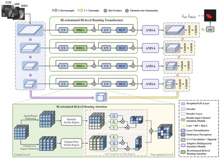 Image credit: ElsevierMultiparametric magnetic resonance imaging (mpMRI) is crucial in excluding serious diseases by providing clear scans that can quickly locate diseased tissue. Subjective assessment of lesion aggressiveness can vary among clinicians. We propose a network for mpMRI segmentation capable of effectively segmenting fine-grained lesion groups in prostate cancer (PCa), with potential applicability to other magnetic resonance imaging (MRI) segmentation tasks such as brain strokes. Specifically, a bi-oriented bi-level routing transformer (BBRT) with a flexible sparse attention mechanism is designed to enhance the network’s target perception. This design optimizes the Transformer’s long-range modeling capabilities. An adaptive multispectral channel attention (AMSA) module with an automatically selected frequency components mechanism is designed to enhance target contour recognition accuracy. It improves the network’s sensitivity to detect crucial texture information. Experiments are conducted using three MRI datasets. Our method achieved a dice similarity coefficient (DSC) of 76.09% for grading PCa on PCAMM, demonstrating improvements of 2.77%, 3.79%, 3.64%, and 0.29 % over the suboptimal method in clinically significant Gleason score (GS) groups (GS 3+4, GS 4+3, GS=8, and GS≥9), respectively. The prostate region segmentation obtained DSC of 94.03% and 84.52% for the central gland (CG) and peripheral zone (PZ), respectively, on PROSTATEx. The stroke segmentation achieved a DSC of 86.33% on ISLES2022. The experimental results demonstrate that the proposed model excels in generalization and outperforms other state-of-the-art methods.